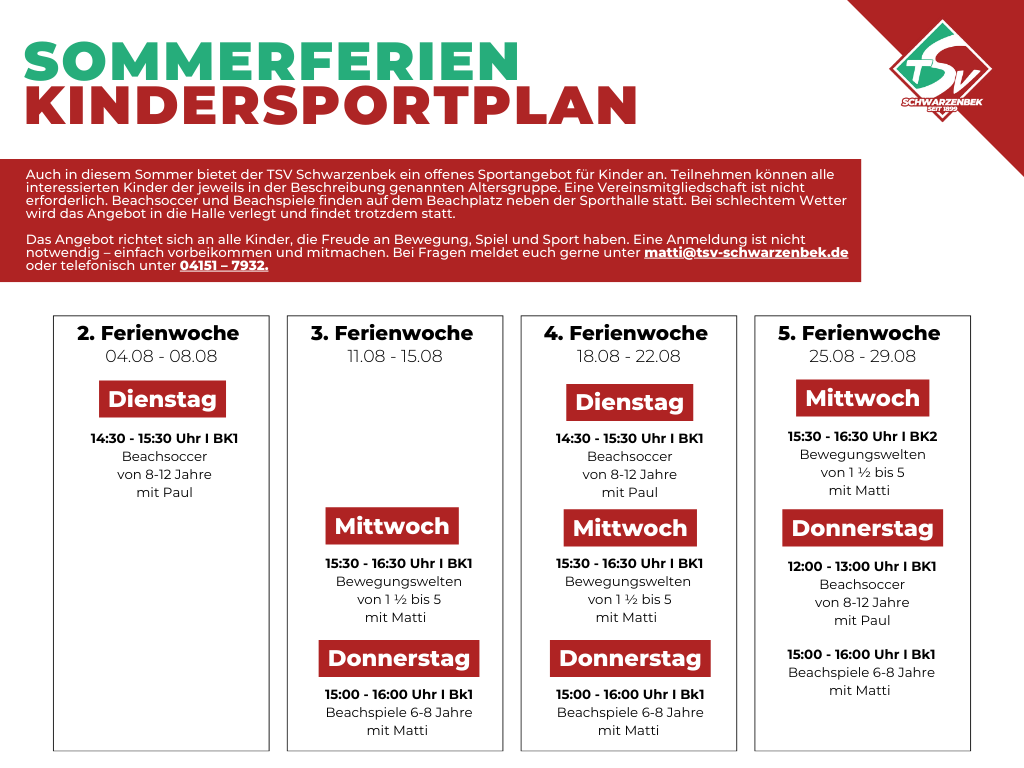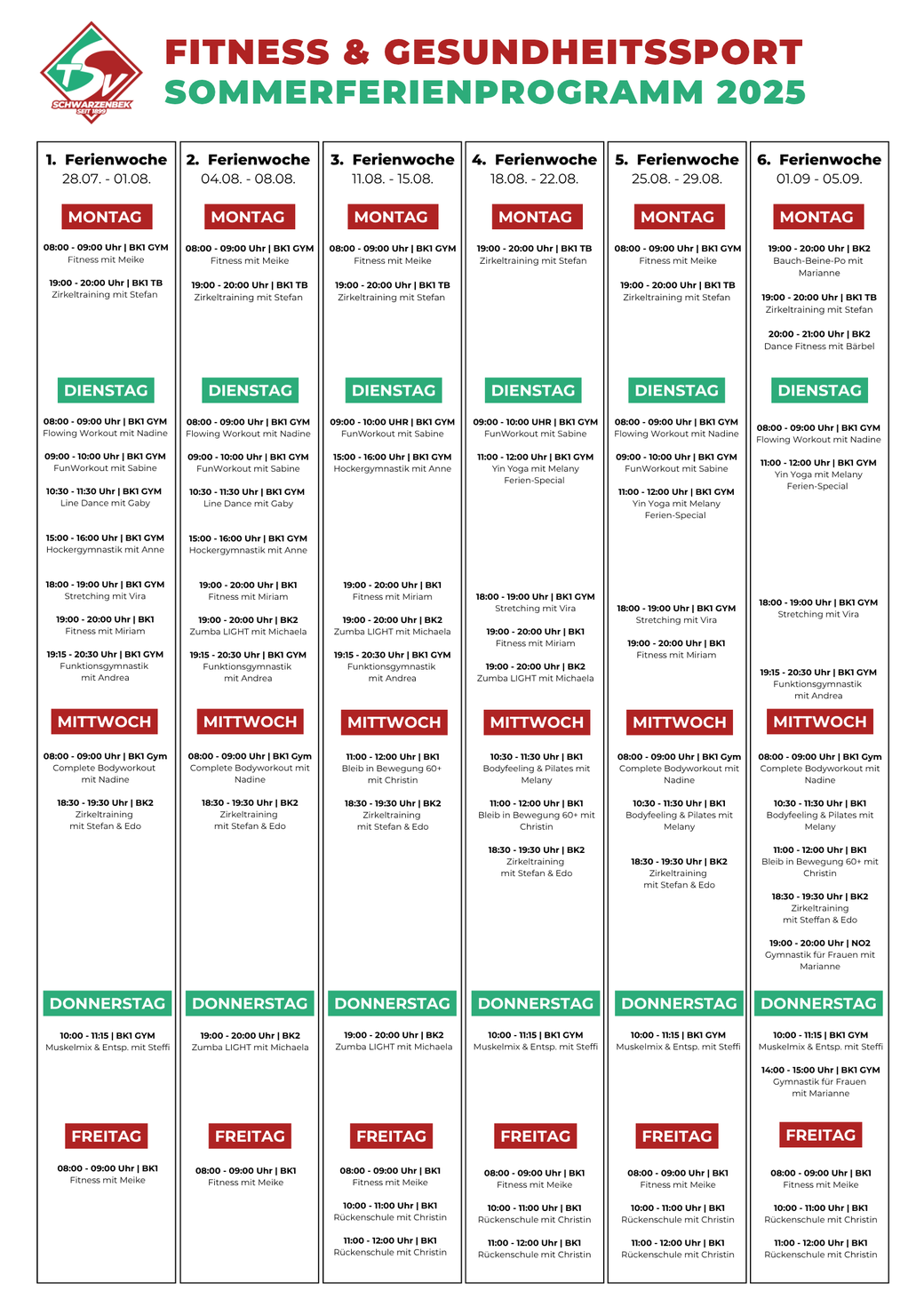 In den Sommerferien bieten wir ein spezielles Sportprogramm mit ausgewählten Kursen an. Welche Angebote in dieser Zeit stattfinden, findet ihr im aktuellen Ferienprogramm. Auch wer bisher noch nicht bei uns dabei war, kann gerne zu den ausgeschriebenen Terminen kommen und unverbindlich mitmachen.